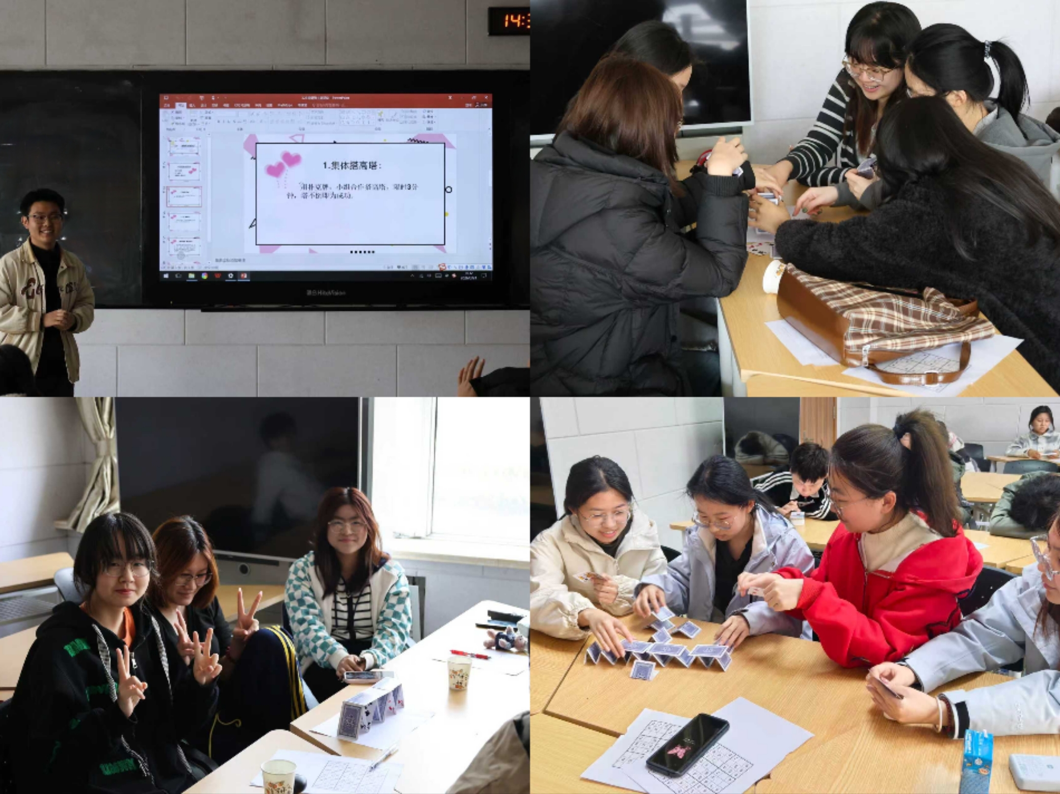 “筑塔凝心”——静力学与团队协作融合体验。为让学生在协作中感知集体力量,活动整合静力学原理与团队动力学,开展扑克牌搭高塔实践。同学们分组运用数理知识规划搭建思路、测算结构稳固性,在分工配合、攻坚克难完成挑战的过程中,真切体会团队支持的意义,有效拉近彼此心理距离,增强集体归属感与心理安全感。