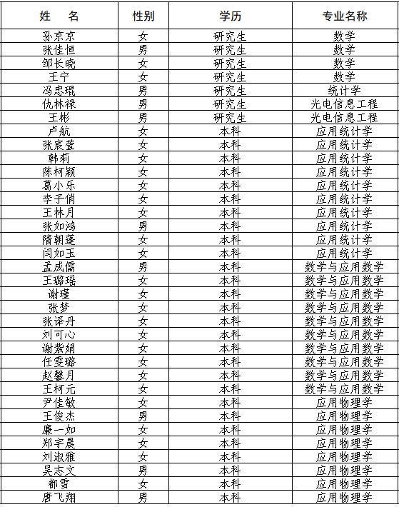 根据学校《关于开展2026届优秀毕业生评选工作的通知》的具体要求,经个人申请、资格审查,在综合测评和民主评议的基础上,秉着公开、公正的原则,拟确定数理学院2026届校级优秀毕业生初选人员名单,现予以公示,公示期为3个工作日,如有异议,请于公示期内实名反映,具体人员见下表。