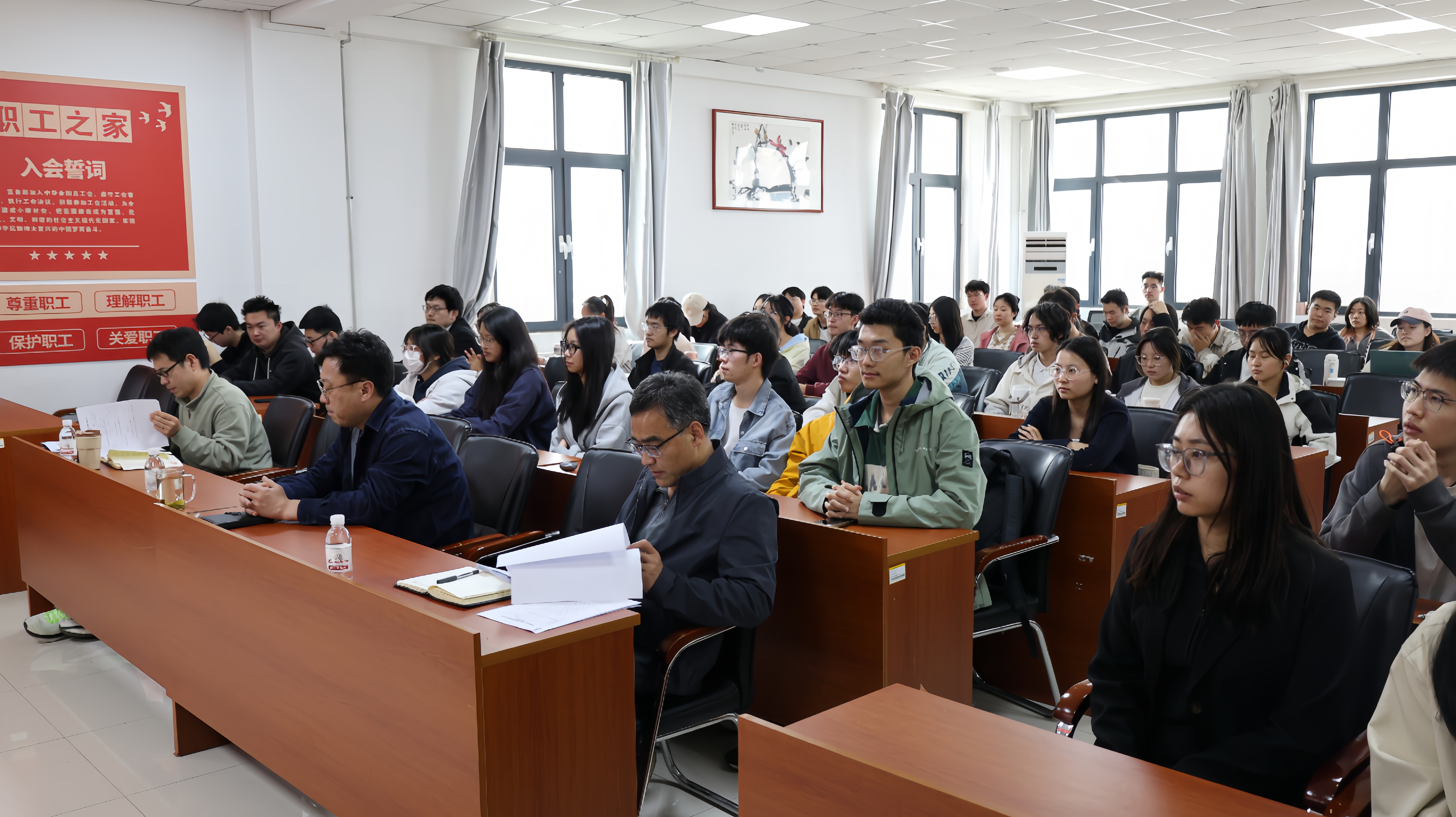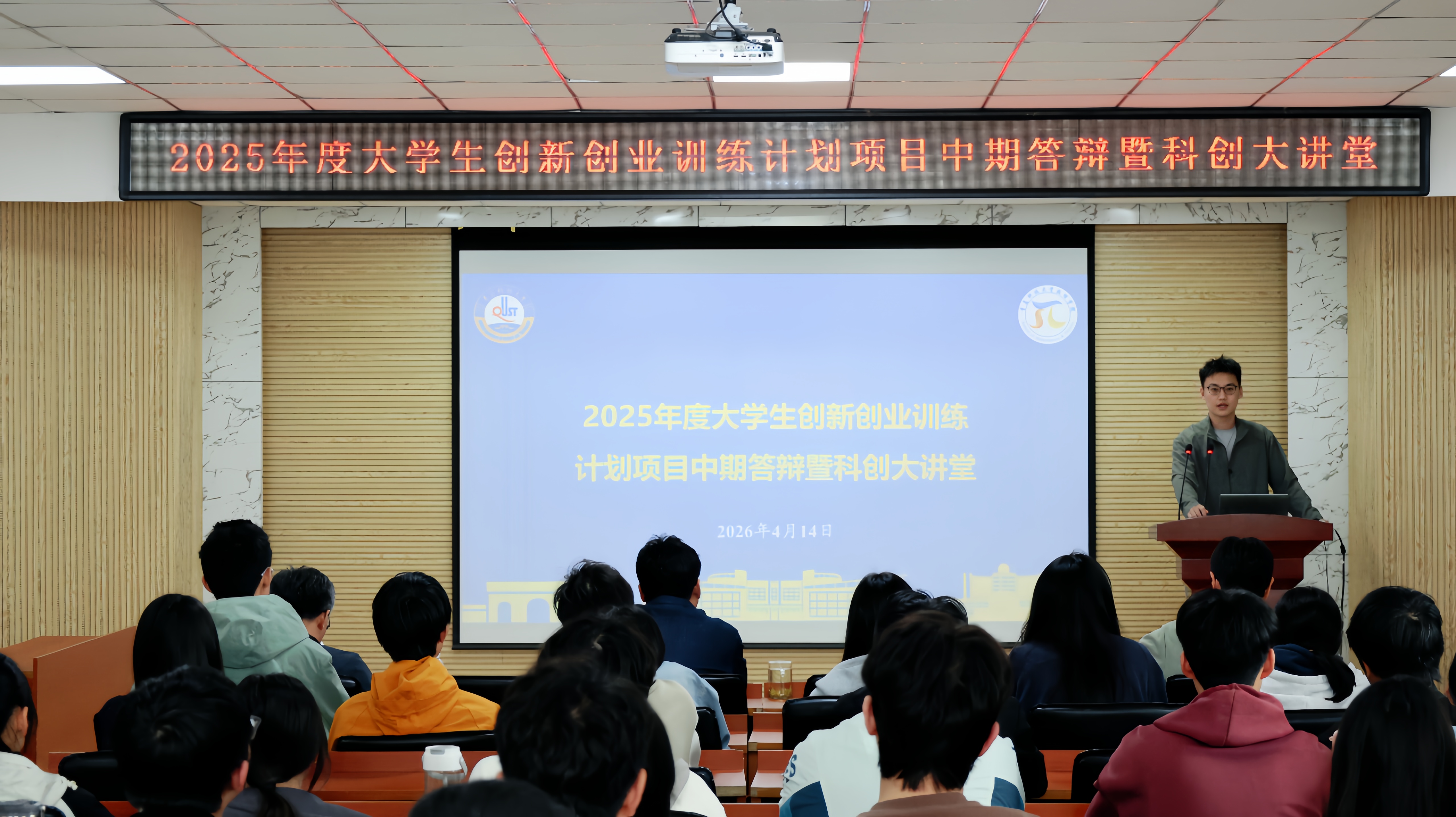 答辩结束后,丁璇思提醒同学们提前谋划立项成果,同时面向观摩学生系统介绍了2026年度大学生创新创业训练计划的赛事布局与申报要点。随后,尹文超主持召开科创大讲堂,围绕学校竞赛奖励政策、优秀学生案例等内容,深入阐释本科生参与创新创业与学科竞赛的重要意义。