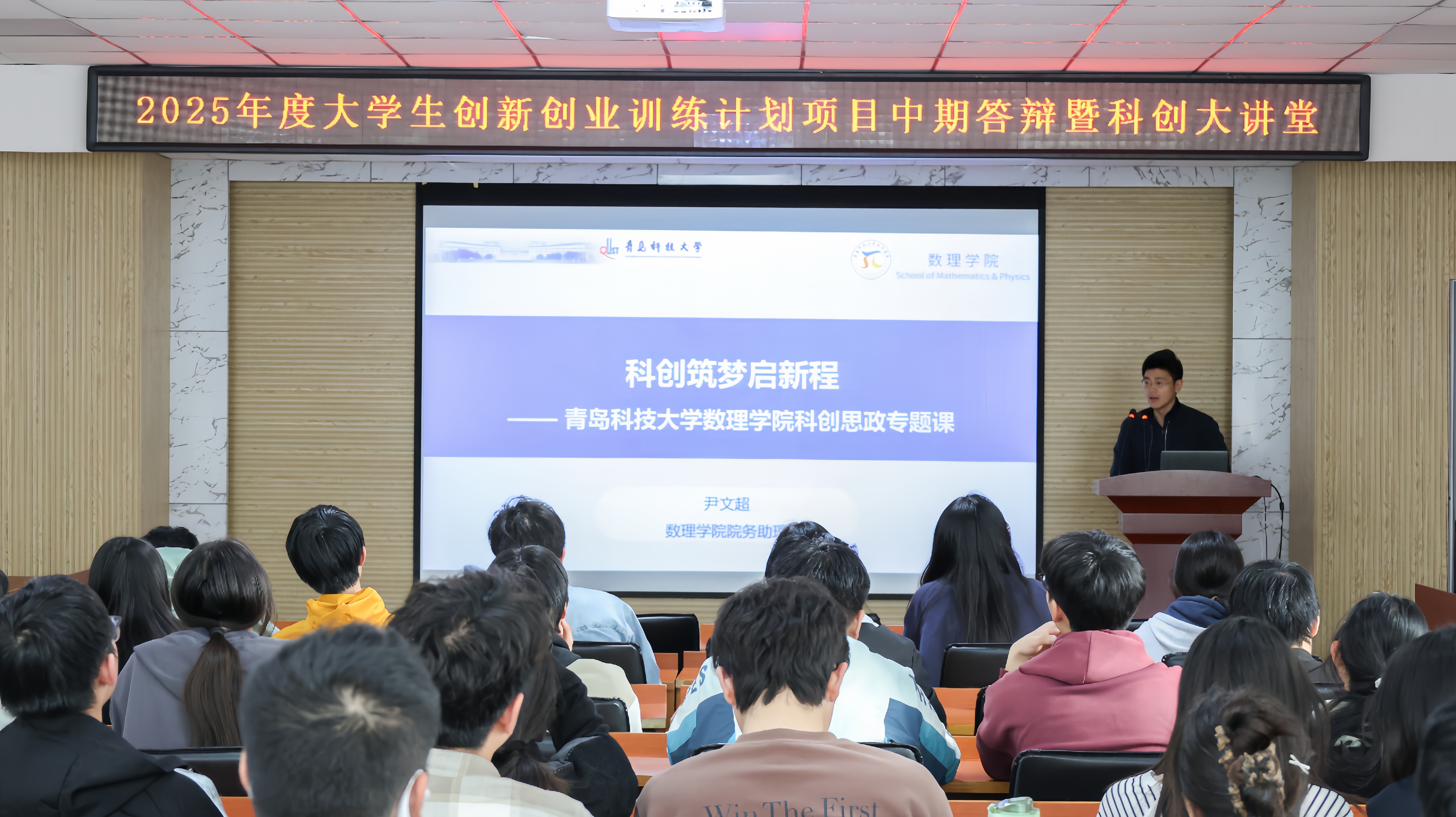 为深入推进大学生创新创业教育工作,4月14日,数理学院举办2025年度大学生创新创业训练计划项目中期答辩暨科创大讲堂。本次活动由学院双创工作联络人丁璇思主持,系主任张瑞坤、高鹏,副主任朱善良担任专家评审,对立项项目进行阶段性核验与专业指导。院务助理尹文超随后作科创思政课讲授。