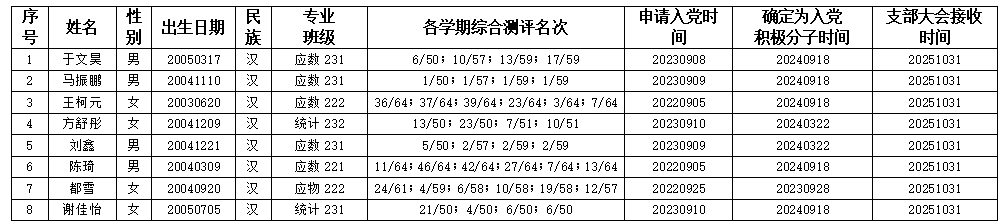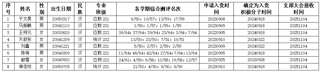 根据《中国共产党章程》和《中国共产党发展党员工作细则》及学校党委《关于发展学生党员工作的意见》(青科大党字〔2014〕77号)文件要求,经数理学院本科生党支部研究,支部大会讨论并投票表决,拟接收于文昊等8名同志为中共预备党员,现将其有关情况予以公示,如有异议请于公示期内反映。