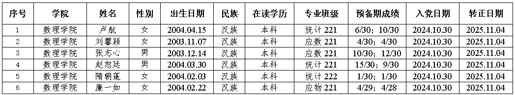 经党组织谈话考察,征求党员、群众和介绍人意见,经数理学院本科生党支部研究,拟将卢航等6位同志转为中共正式党员,公示期为2025年11月4日-11月10日,如有异议,请实名向学院反映。